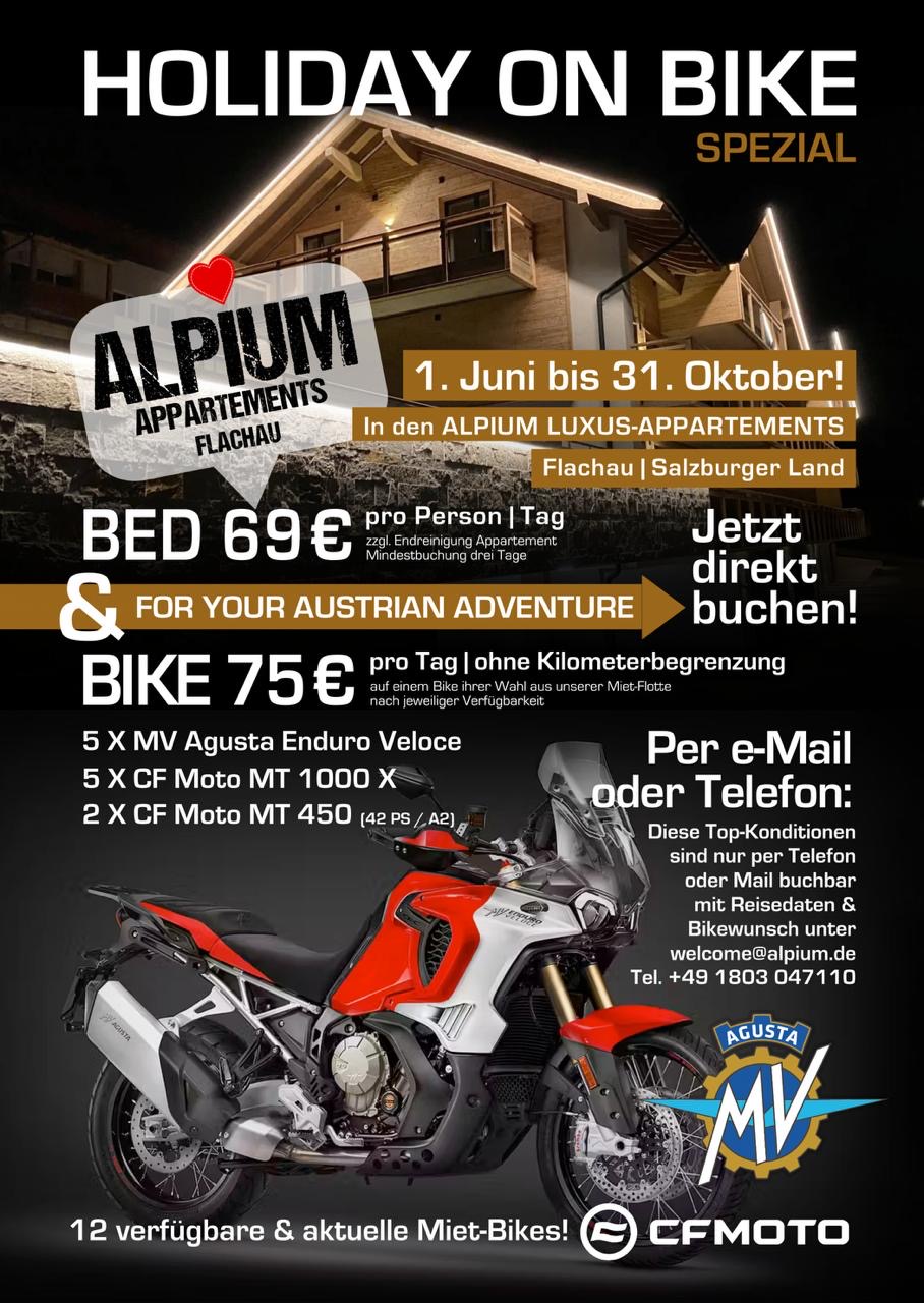 Zunächst bieten wir Dir stilvolle Übernachtungen in einem der zehn luxuriösen ALPIUM-Ferien-Appartements in Flachau mit 1, 2, oder 3 Schlafzimmern und echter Vollausstattung – u.a komplett eingerichtete Küche, schnelles Internet, modernes Infotainment/TV, große Terrasse/Balkon, meist eigene Sauna im Badbereich. Das alles PLUS einem im Preis enthaltenen, brandneuen Adventure-Mietmotorrad von KTM oder MV Agusta für den gebuchten Zeitraum (Mindestbuchung drei Tage). Beides zusammen zum Top-Tarif von 99 Euro pro Übernachtung. Begleiter(innen) zahlen 69 Euro (ohne Bike) pro Übernachtung im Appartement des Fahrers/der Fahrerin. Hinzu kommen jeweils der örtliche CityTax und die Endreinigung.